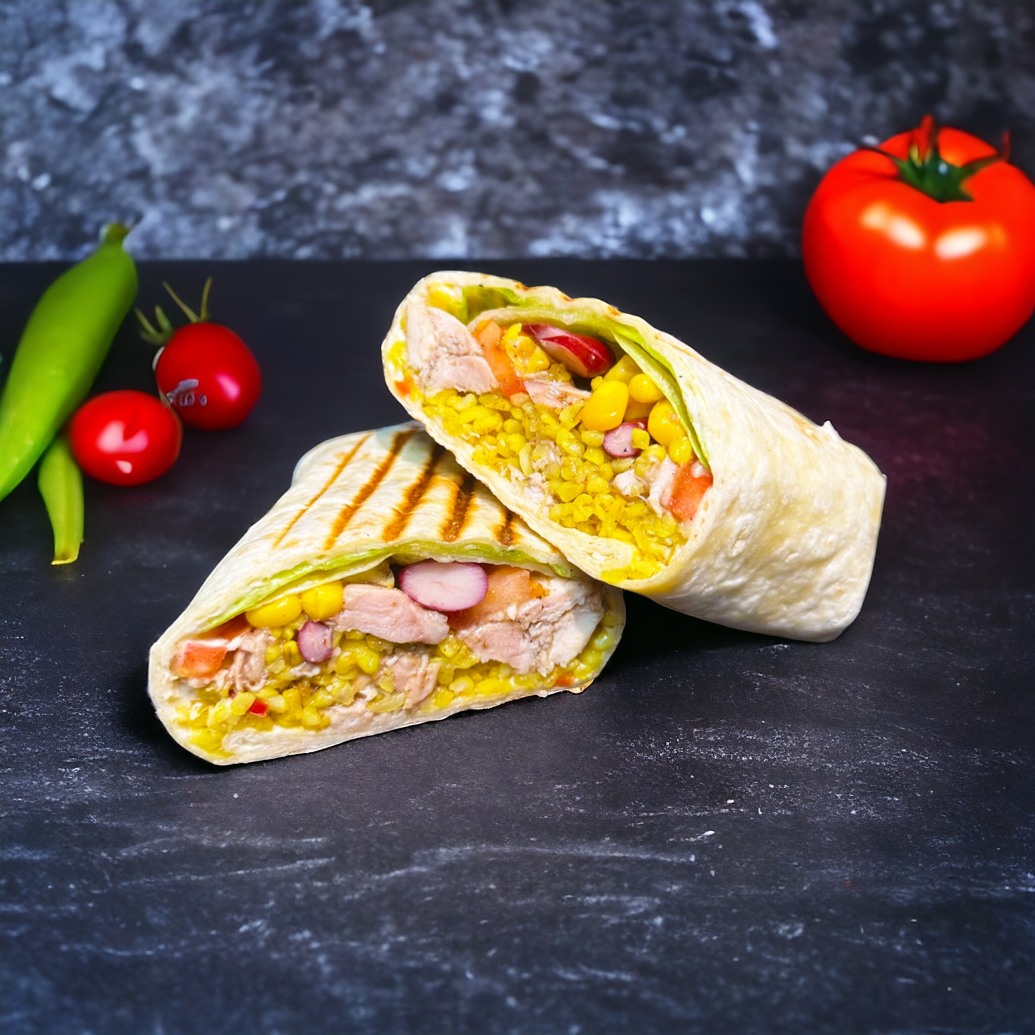 Mexican cooked chicken, tortilla, cheese garlic sauce, mexican bulgur, tomatoes, sweetcorn, black beans, lettuce and jalapeño (350g)