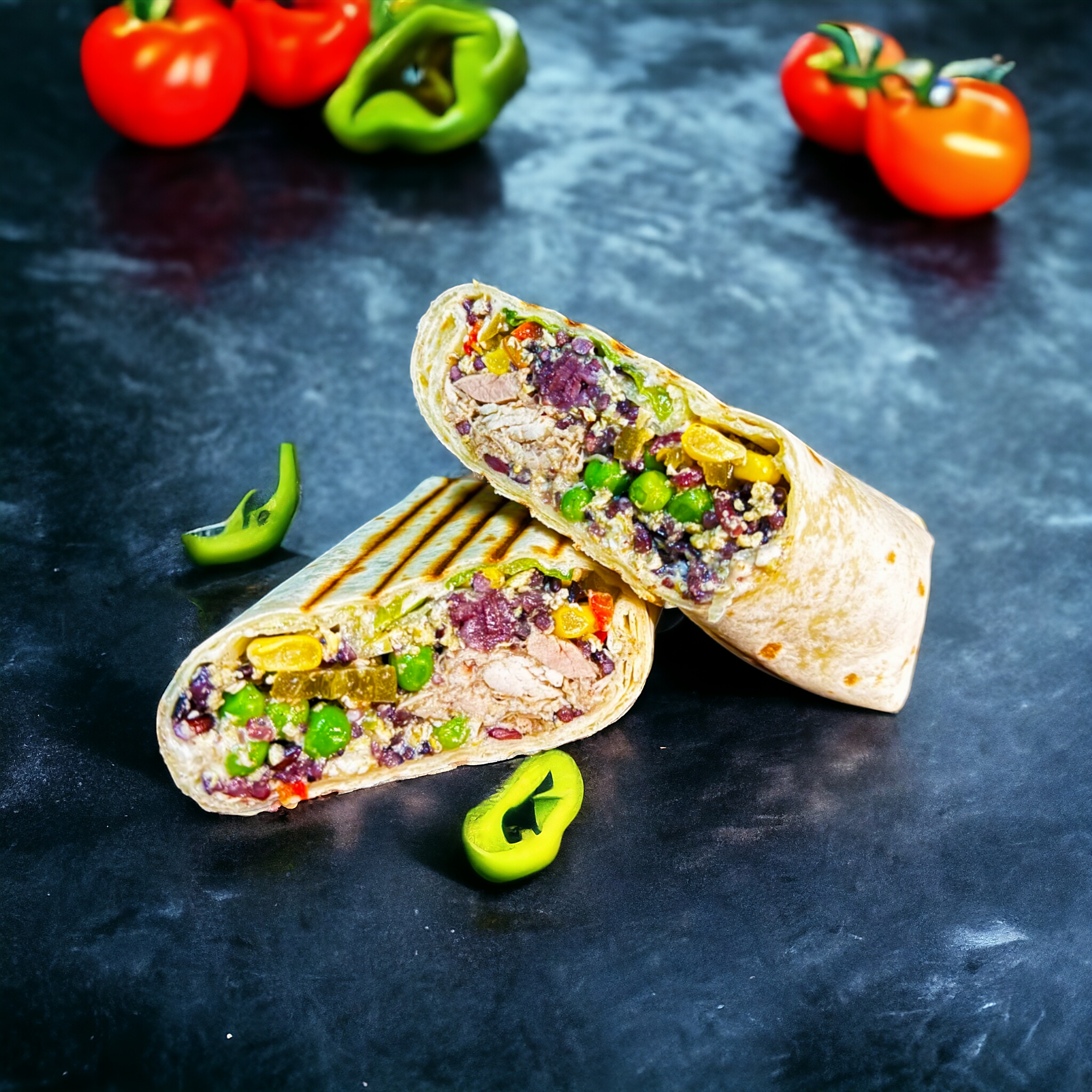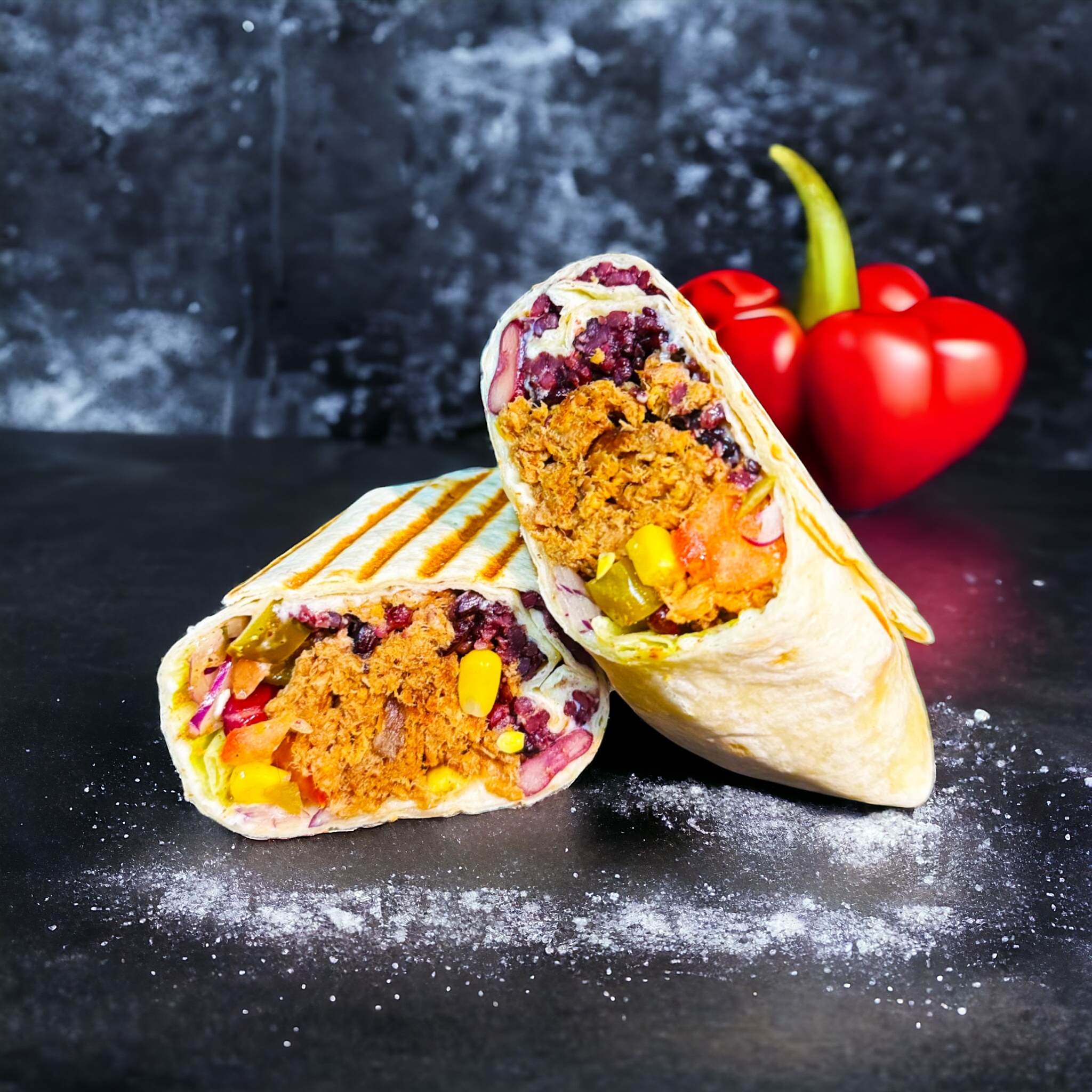 Vegan chicken, tortilla, vegan garlic sauce, mexican black rice, tomatoes, sweetcorn, black beans, lettuce and jalapeño (350g)